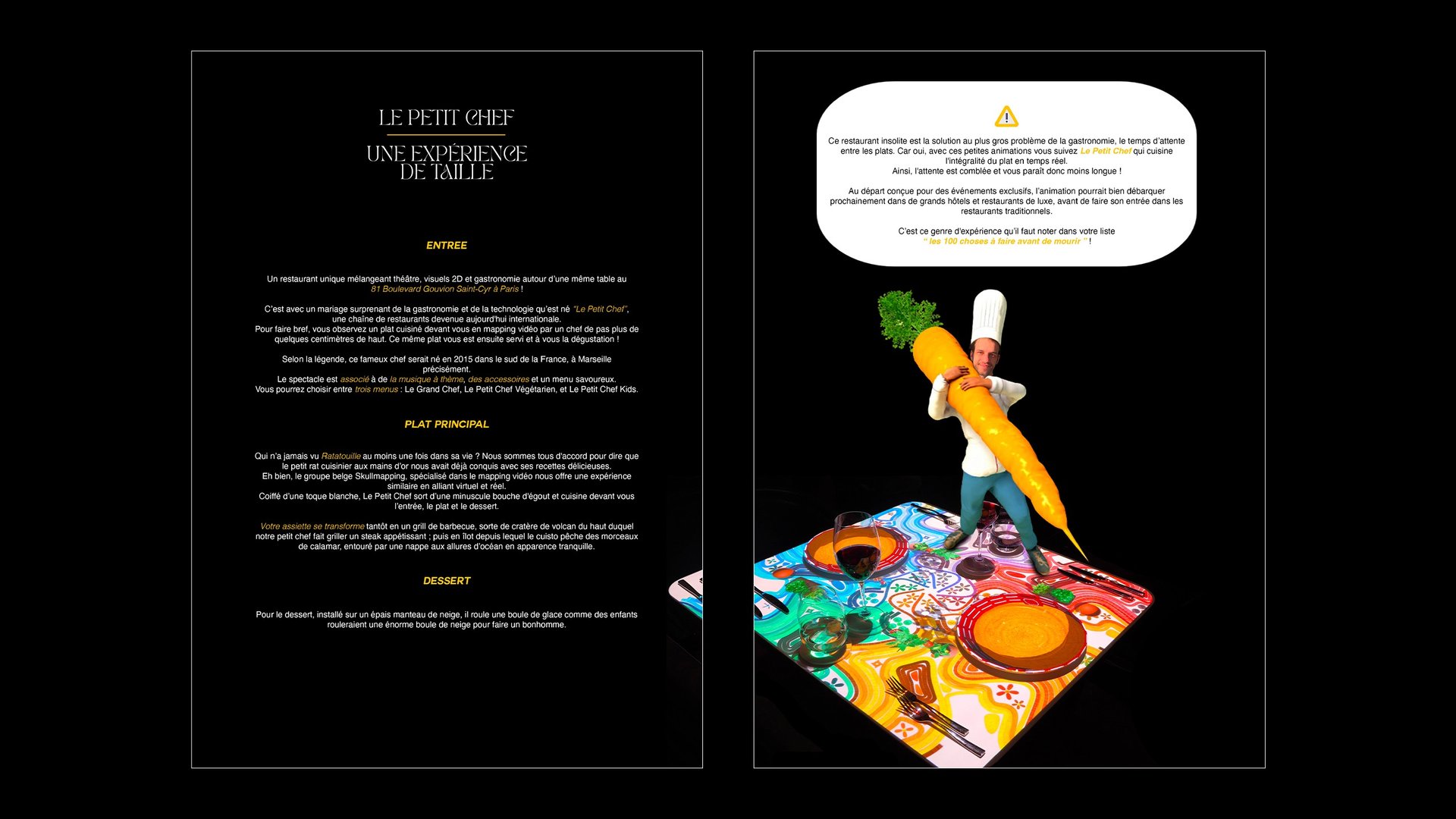 Le Petit Chef is a unique restaurant in Paris that blends gastronomy, theater, and video mapping right on the diner's table. Created in Marseille in 2015 by the Belgian group Skullmapping, the concept features a tiny animated chef who cooks in real time directly on your plate.