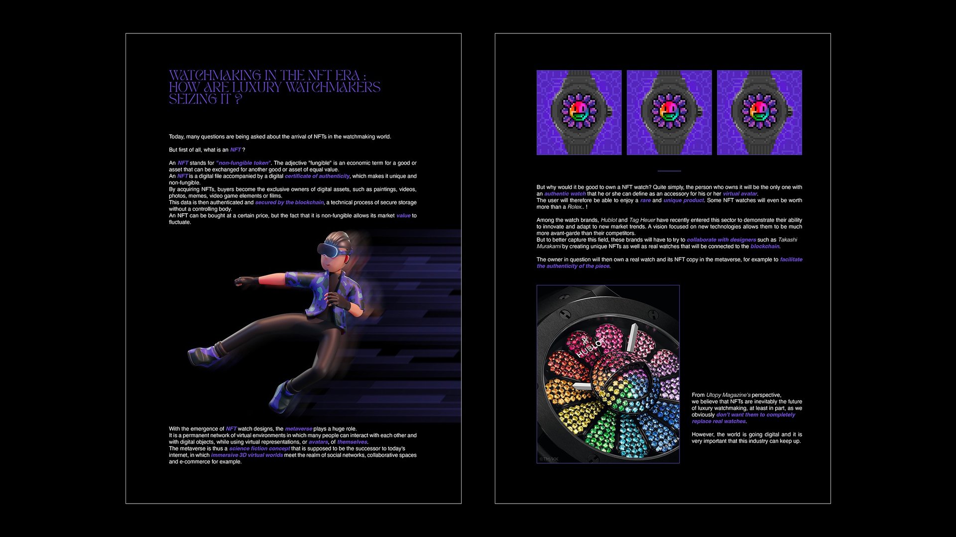 This article explores the integration of NFTs in the world of luxury watchmaking. It begins by explaining what an NFT is: a unique digital file secured by the blockchain. The metaverse plays a central role, allowing owners to showcase their watch through a virtual avatar.